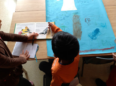J, a student in the AM class, has likewise taken a leadership role in the growing bird inquiry group. She started a collaborative interest poster with a carefully labeled diagram of a robin. Her many pictures and diagrams shared with the group lead her to come up with a wonderful idea one day: "Let's make a book about birds". When I asked if she wanted to share with families too, which is what we do when we make our online Voicethread books, she added: "How about: We Can See Birds! A book about all the birds we see". This story and many more have unfolded in the weeks since I first hung the poster and set up a bird-watching window. Bird interest centres popped up in several places around the room, and students began making their own individual bird Voicethreads. That, however, is a story for another day.